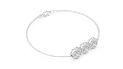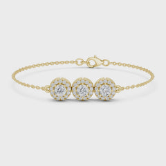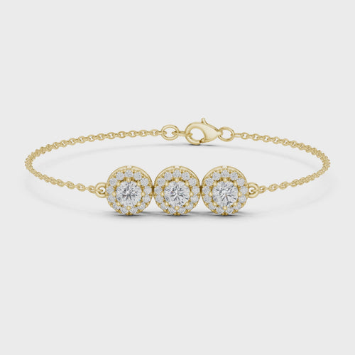 Elegant and understated, this Triple Halo Lab-Grown Diamond Chain Bracelet in 18K Gold features three round brilliant centre diamonds, each surrounded by a delicate halo of smaller diamonds.