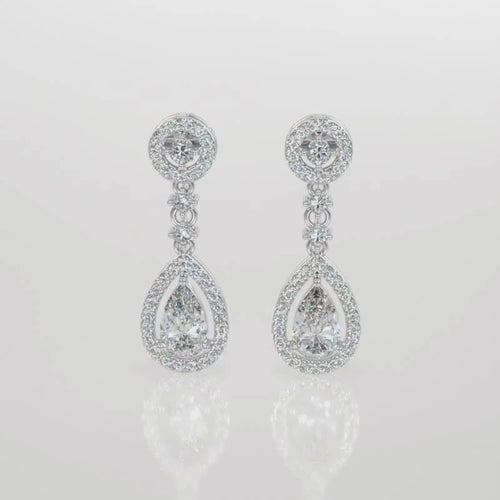 Elevate your elegance with our Graceful Teardrop Lab-Grown Diamond Drop Earrings. These exquisite earrings feature a captivating design with pear-shaped diamonds, framed by halos of smaller diamonds that enhance their brilliance. The delicate drop style is further adorned with round-cut diamonds, adding a touch of sophistication and glamour. Crafted in lustrous white gold, these earrings are perfect for special occasions or adding a luxurious touch to your everyday look. Embrace the beauty of sustainable luxury with these stunning lab-grown diamond earrings, offering an ethical and dazzling choice for the modern jewelry lover.