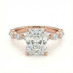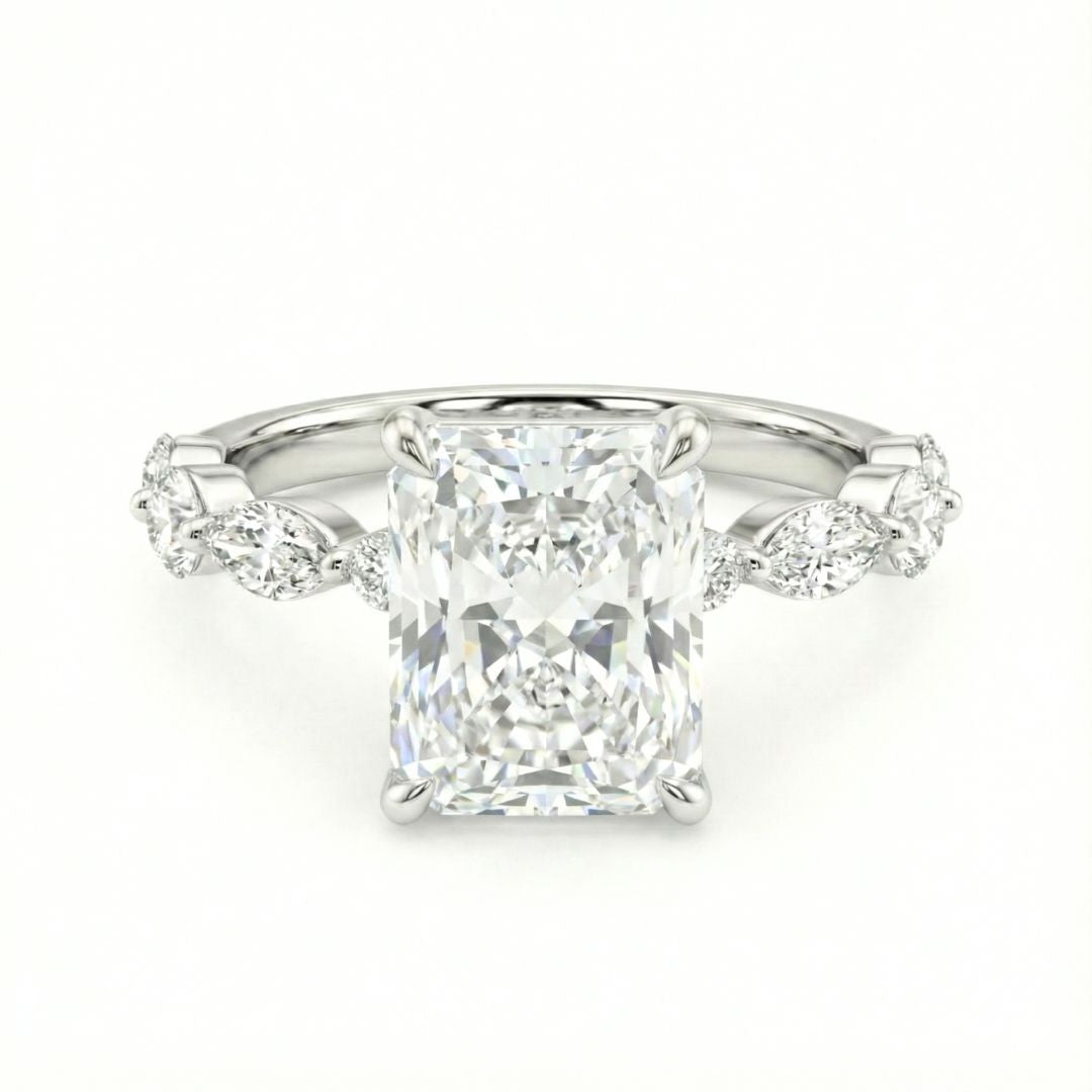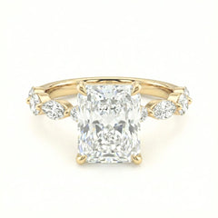 This stunning Radiant Cut Lab Grown Diamond Ring features a brilliant centre stone available in 2 carat, 3 carat, 4 carat and 5 carat options. The Radiant centre is paired with marquise and round side stones, creating a beautifully balanced, high-sparkle silhouette. Crafted in premium 18K white, yellow and rose gold, the alternating marquise-and-round side diamonds add elegance, symmetry and refined luxury. Each centre diamond is IGI certified, ensuring exceptional clarity, symmetry and light performance. A bold, glamorous and sophisticated fine-jewellery masterpiece designed for maximum impact.