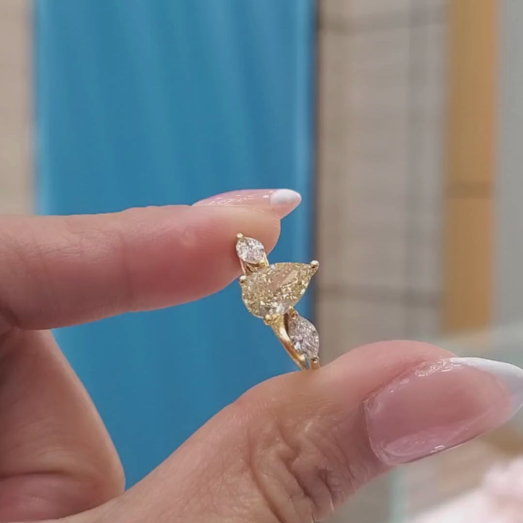 1.50ct Fancy Yellow Lab Grown Diamond Trilogy Ring | Three Stone Pear Solitaire with Marquise Side Diamonds | 18k Gold