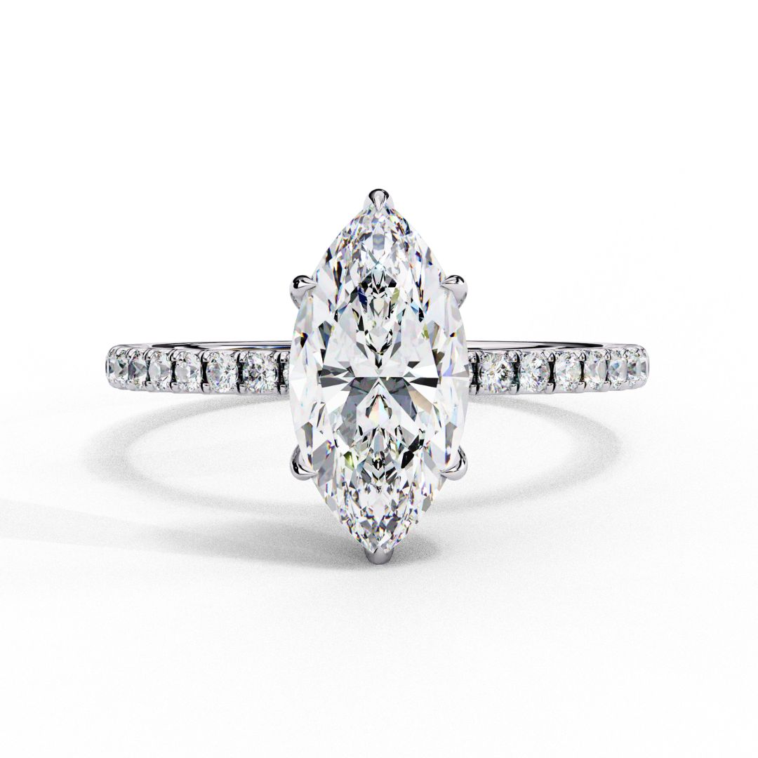 Available in 1.00 to 5.00 carats, this striking Marquise Cut Lab Grown Diamond Engagement Ring blends classic elegance with modern sophistication. The centrepiece is a beautifully faceted marquise diamond — elongated to flatter the hand — set in a secure six-prong solitaire setting.