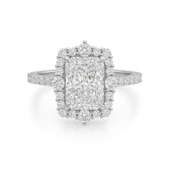 2 Carat Radiant Cut Lab Grown Diamond Engagement Ring. Designed with timeless elegance and modern brilliance, this ring features a striking radiant cut center stone surrounded by a sparkling diamond halo, enhancing its fire and brilliance. The band is adorned with side diamonds, creating an endless shimmer from every angle.