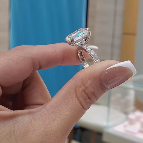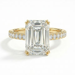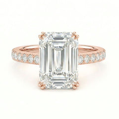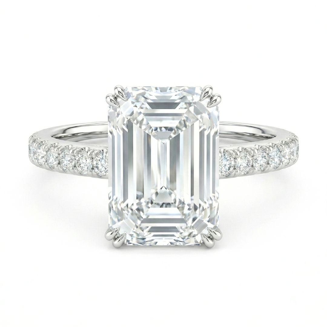 7 Carat Emerald Cut Lab Grown Diamond Solitaire Ring | Hidden Halo & Pavé Band | IGI Certified | 18K White, Yellow & Rose Gold