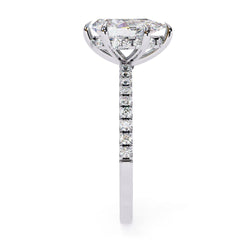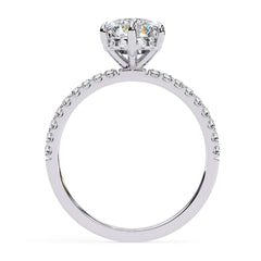 Available in 1.00 to 5.00 carats, this exquisite Pear Cut Lab Grown Diamond Engagement Ring features a signature teardrop-shaped centre stone, set in a secure five-prong solitaire setting. The band is pavé-set with lab grown diamonds for added brilliance, while a hidden halo beneath the centre diamond adds a striking touch of sparkle visible from the side.