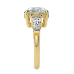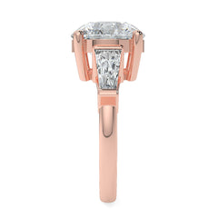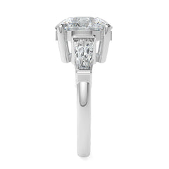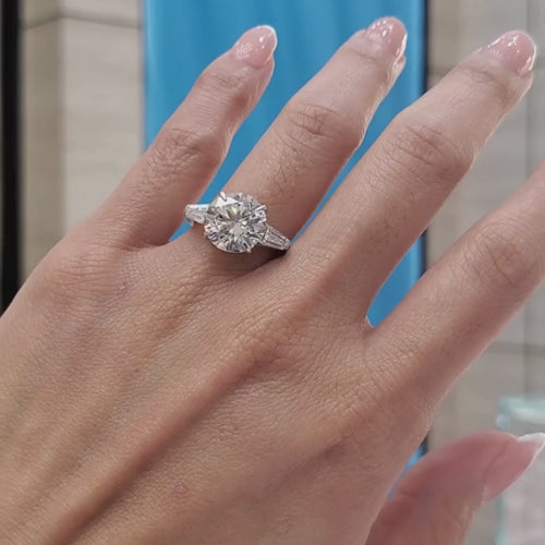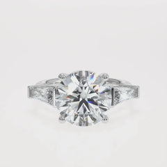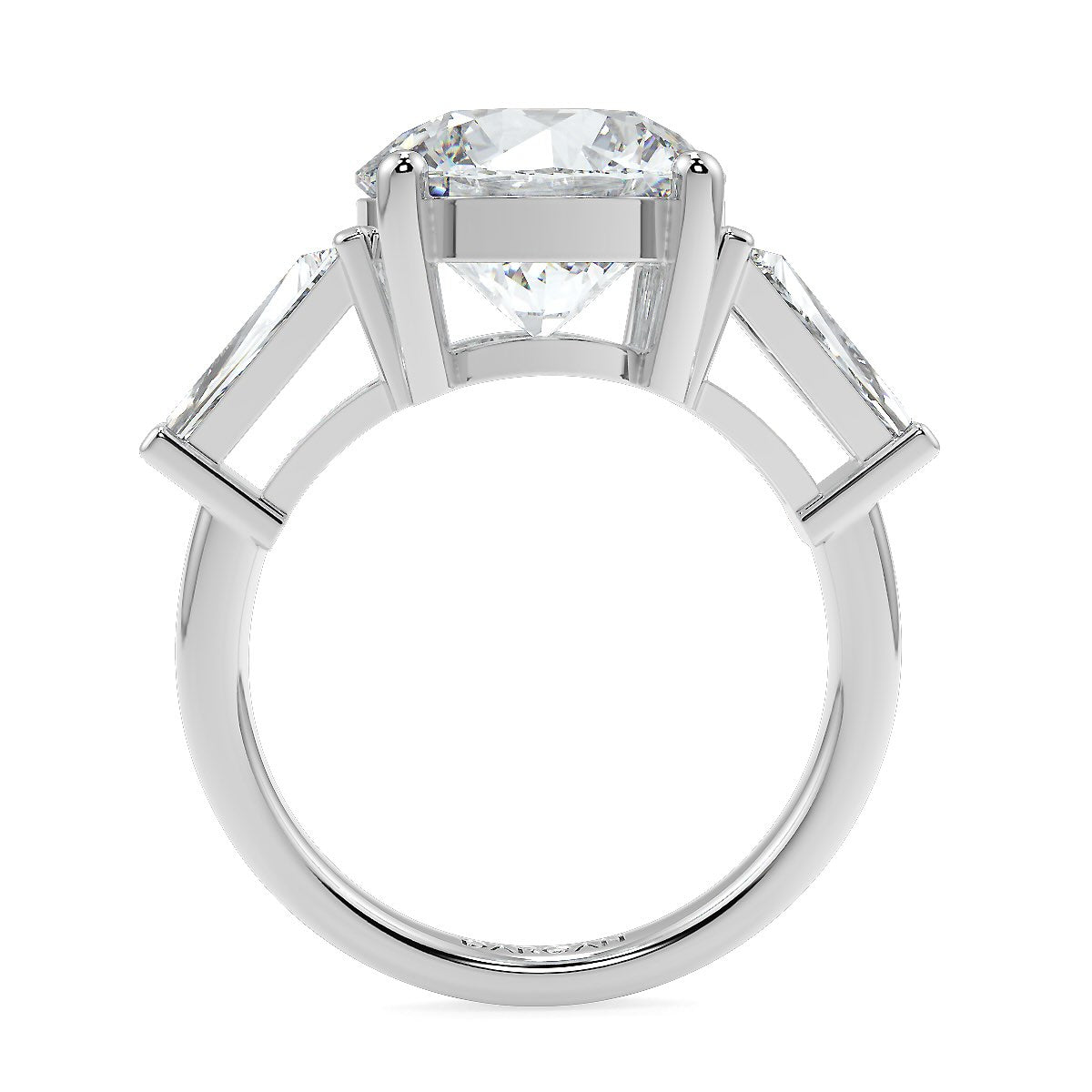 Each ring is flanked by 0.30 carat tapered baguette diamonds on either side, enhancing brilliance and adding a sleek, refined silhouette to the design.