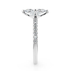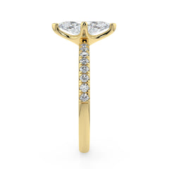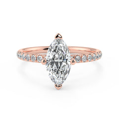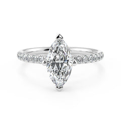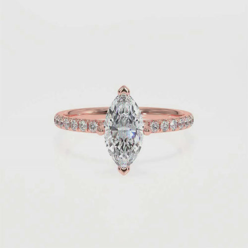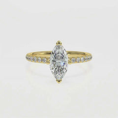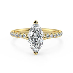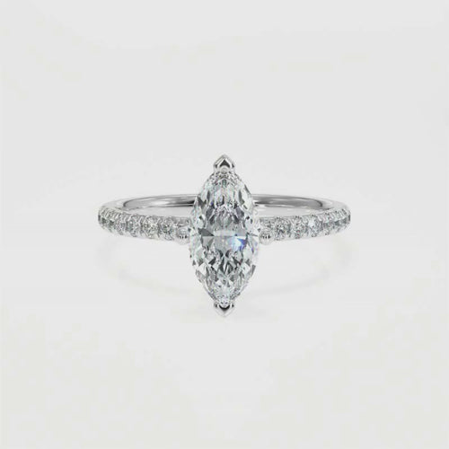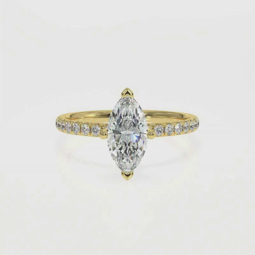 This Marquise Cut Lab Grown Diamond Ring features an elongated centre stone that enhances brilliance and finger length. Available in 1, 1.5, 2, 2.5 and 3 carats, and crafted in 18K white, yellow or rose gold with pavé-set lab grown diamonds on the band. IGI certified for quality, clarity and brilliance. A luxurious, sustainable and timeless choice.